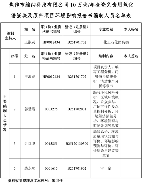 關于焦作市維納科技有限公司10萬塊/年全瓷義齒用氧化鋯瓷塊及原料項目環評報告書信息公司。