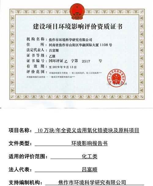 關于焦作市維納科技有限公司10萬塊/年全瓷義齒用氧化鋯瓷塊及原料項目環評報告書信息公司